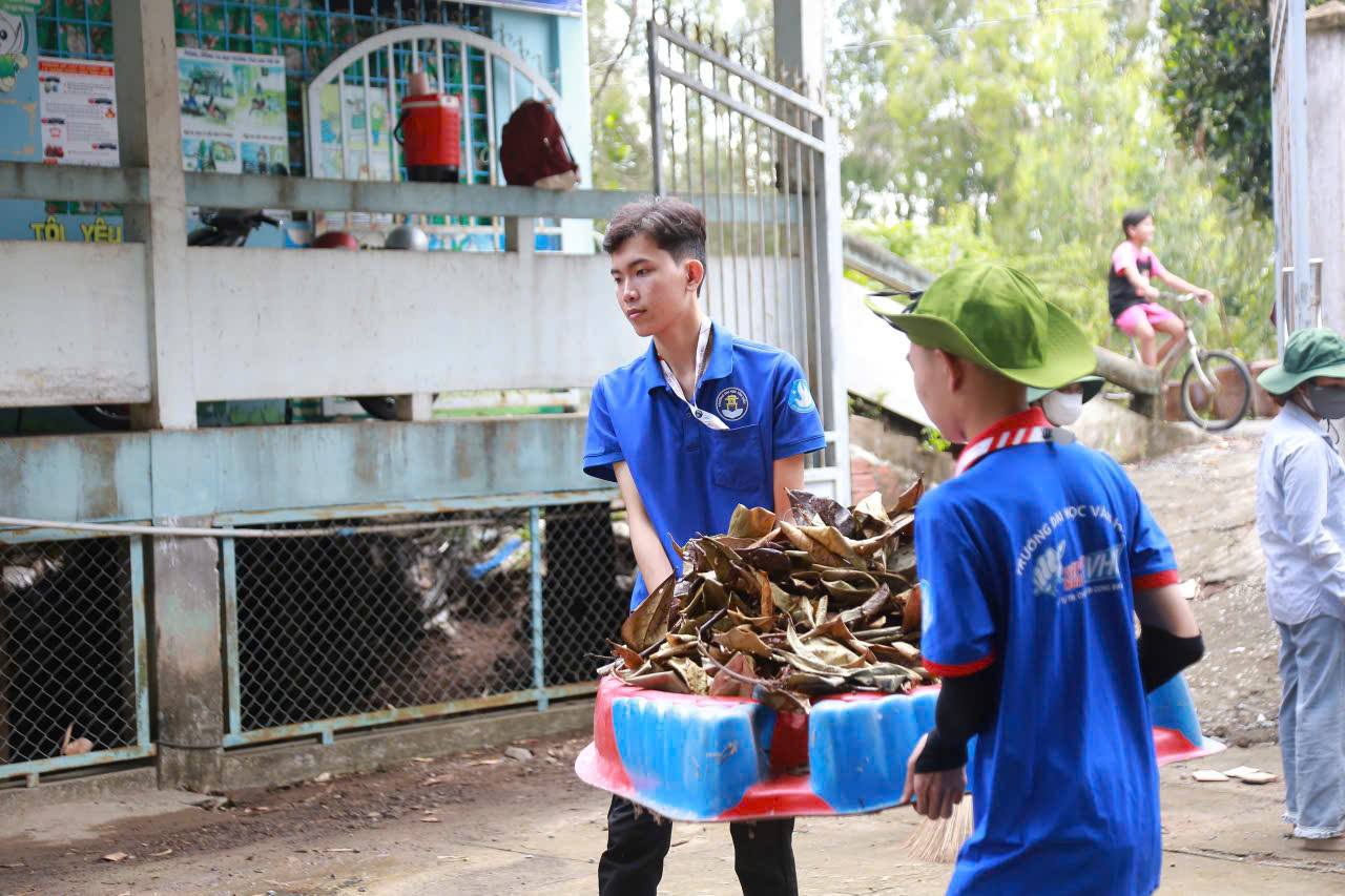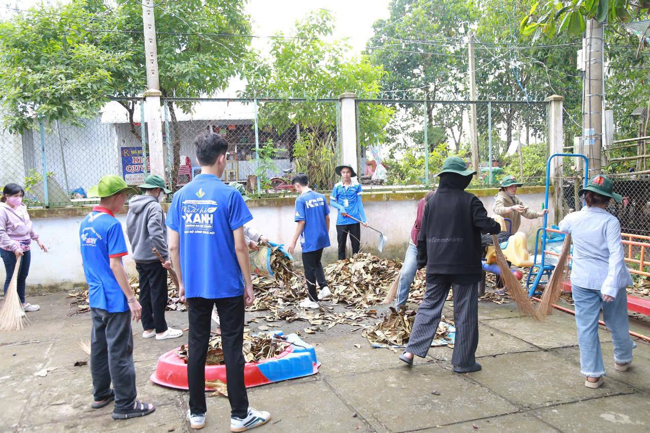 Cùng ngày, tại xã Phú Cường, ngay sau Lễ tiếp nhận chiến sĩ, các bạn bắt tay vào dọn dẹp, chỉnh trang Trường Mầm non Hoa Sen: quét dọn, cắt tỉa cây, cải tạo vườn rau, sơn mới khuôn viên, tạo môi trường học tập xanh – sạch – đẹp cho các em nhỏ.