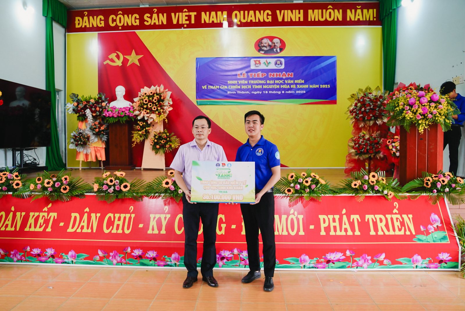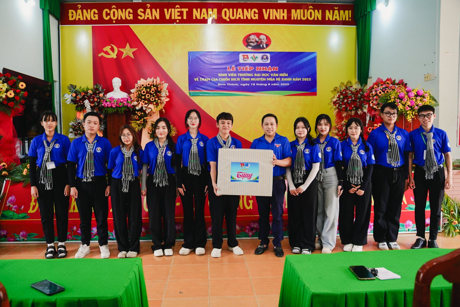 Chiều cùng ngày tại UBND xã Bình Thành, Ban Chỉ huy Chiến dịch Trường Đại học Văn Hiến phối hợp cùng Xã Đoàn Bình Thành đã long trọng tổ chức Lễ tiếp nhận chiến sĩ Mùa hè xanh năm 2025.