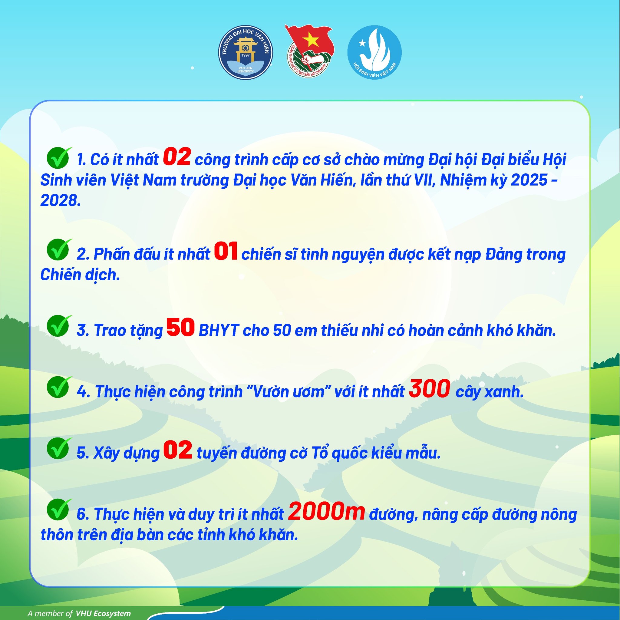Chiến dịch Mùa hè xanh 2025 Trường Đại học Văn Hiến đã chính thức khởi động với Hệ thống chỉ tiêu vô cùng thiết thực và đầy tính nhân văn, trải dài từ các công trình cơ sở, hỗ trợ cộng đồng, chăm lo cho trẻ em, gia đình chính sách, đến cải tạo môi trường sống, xây dựng cảnh quan xanh – sạch – đẹp.