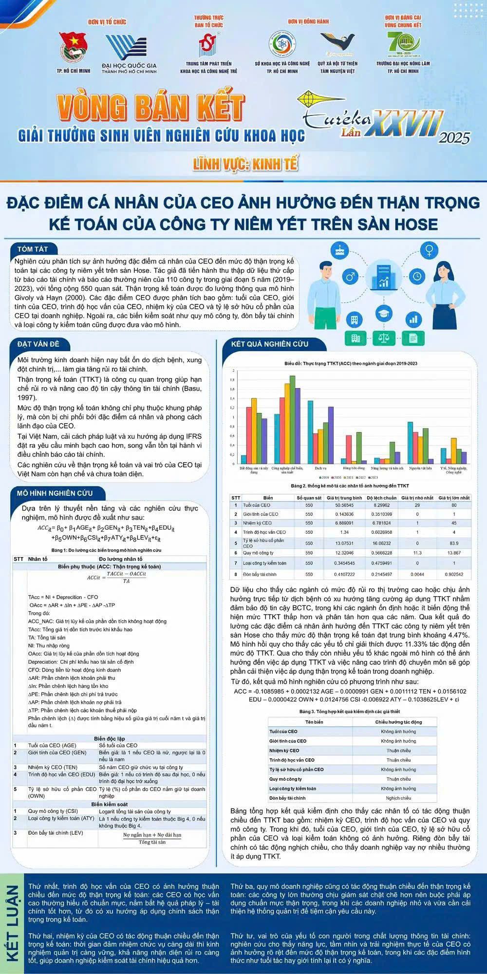 Tên đề tài dự thi của sinh viên VHU: “Đặc điểm cá nhân của CEO ảnh hưởng đến thận trọng kế toán của các công ty trên sàn Hose"