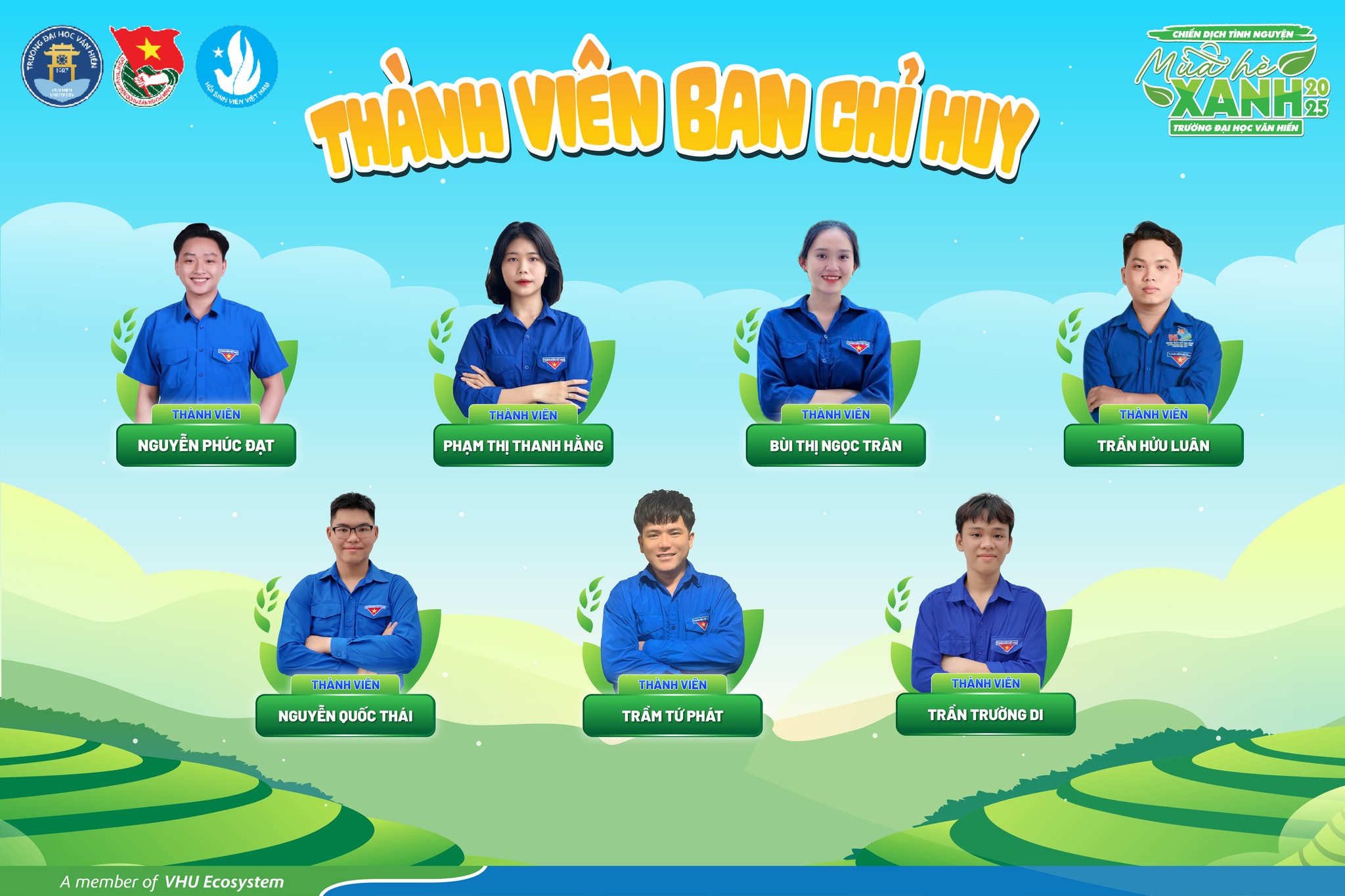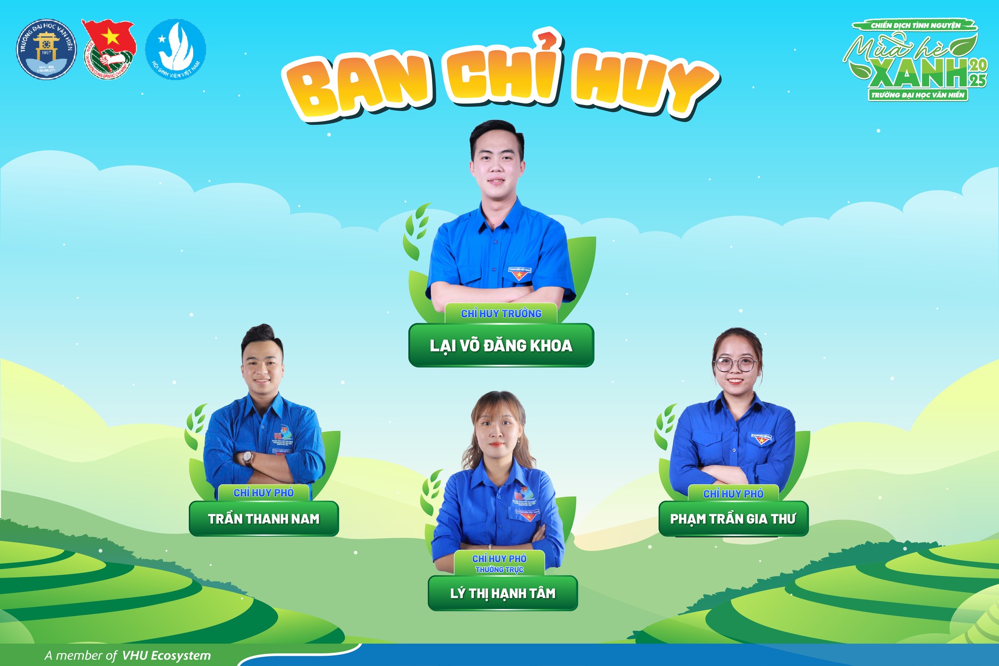 Đồng hành cùng các bạn là Ban Chỉ huy Chiến dịch những người tận tâm, bản lĩnh, sẵn sàng “cháy” hết mình vì tập thể. Họ sẽ cùng chiến sĩ giữ vững tinh thần “Chiến sĩ tình nguyện Mùa hè Xanh Trường Đại học Văn Hiến xung kích, tình nguyện vì cộng đồng”, thực hiện phương châm “Đi để trải nghiệm - Đi để rèn luyện - Đi để cống hiến - Đi để trưởng thành”, mang màu áo xanh đến gần hơn với từng địa phương.
