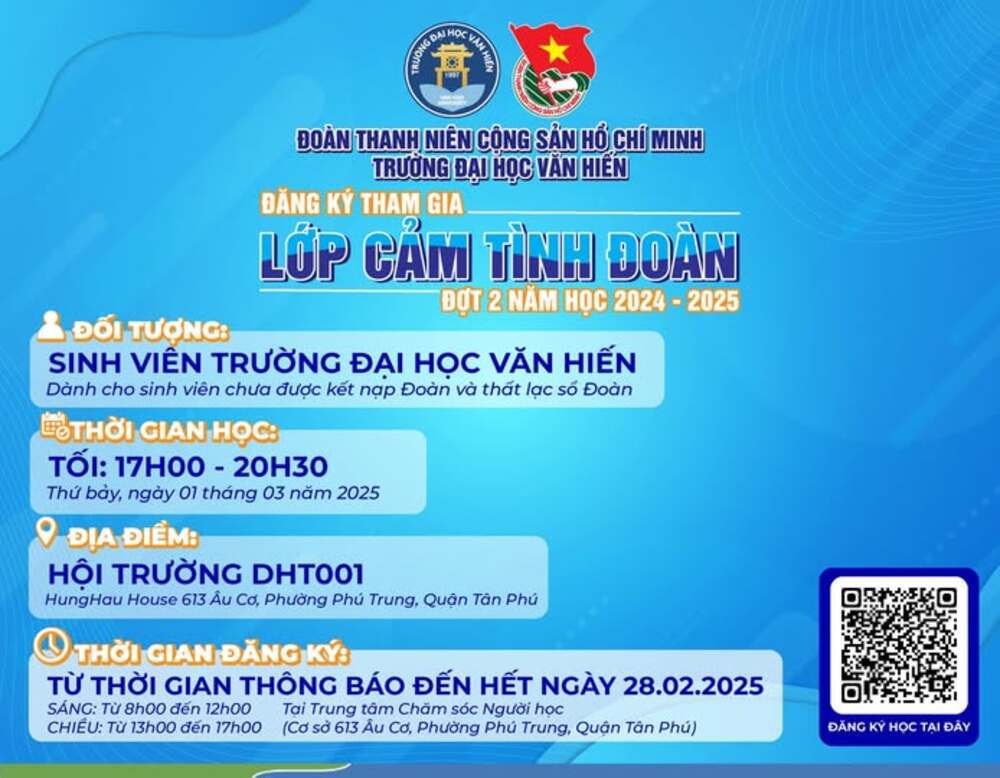 Cơ hội đã đến! Lớp Cảm tình Đoàn đợt 2, năm học 2024 - 2025 chính thức nhận đăng ký. Đây là bước đầu để bạn gia nhập Đoàn TNCS Hồ Chí Minh, cùng hàng triệu thanh niên Việt Nam viết tiếp hành trình tuổi trẻ đầy ý nghĩa, đóng góp cho cộng đồng và xây dựng quê hương, đất nước.