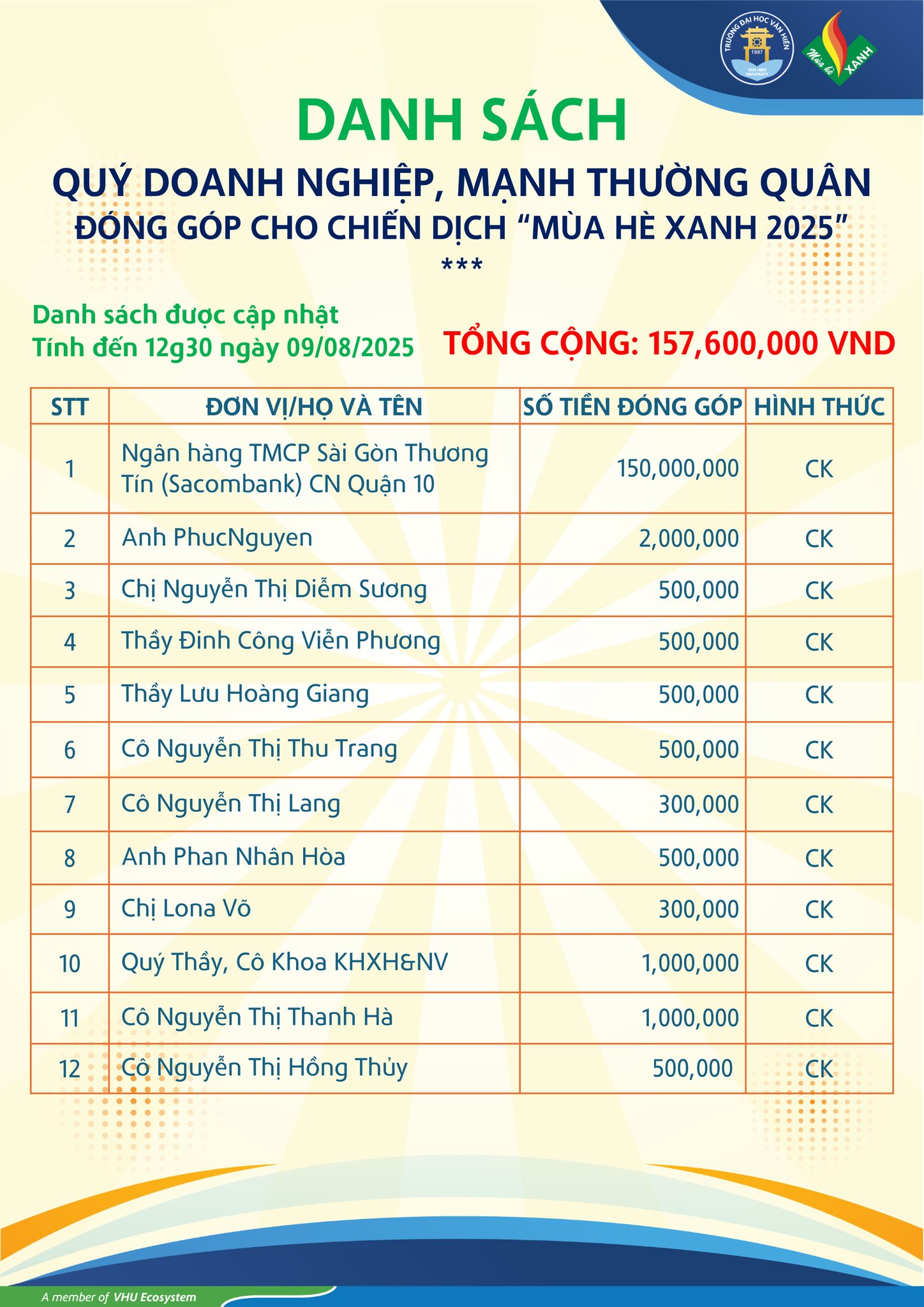 Chiến dịch Mùa Hè Xanh 2025 vẫn đang tiếp tục nhận sự đóng góp từ các tổ chức, cá nhân. Mùa hè năm nay, Ban Chỉ huy và các bạn chiến sĩ tình nguyện mong muốn quy mô chiến dịch với nhiều công trình, phần việc ý nghĩa đến cộng đồng. Chính vì vậy, Ban Chỉ huy chiến dịch kêu gọi sự tiếp tục đồng hành và tài trợ của các đơn vị, doanh nghiệp đến ngày 15/08/2025 với các hạng mục sau: