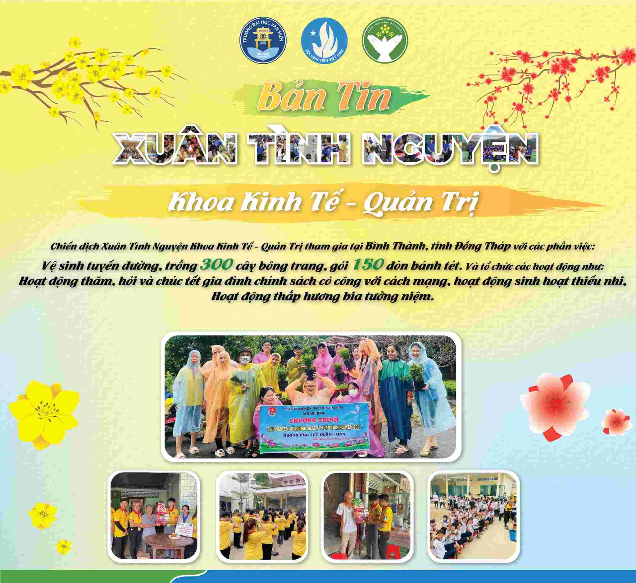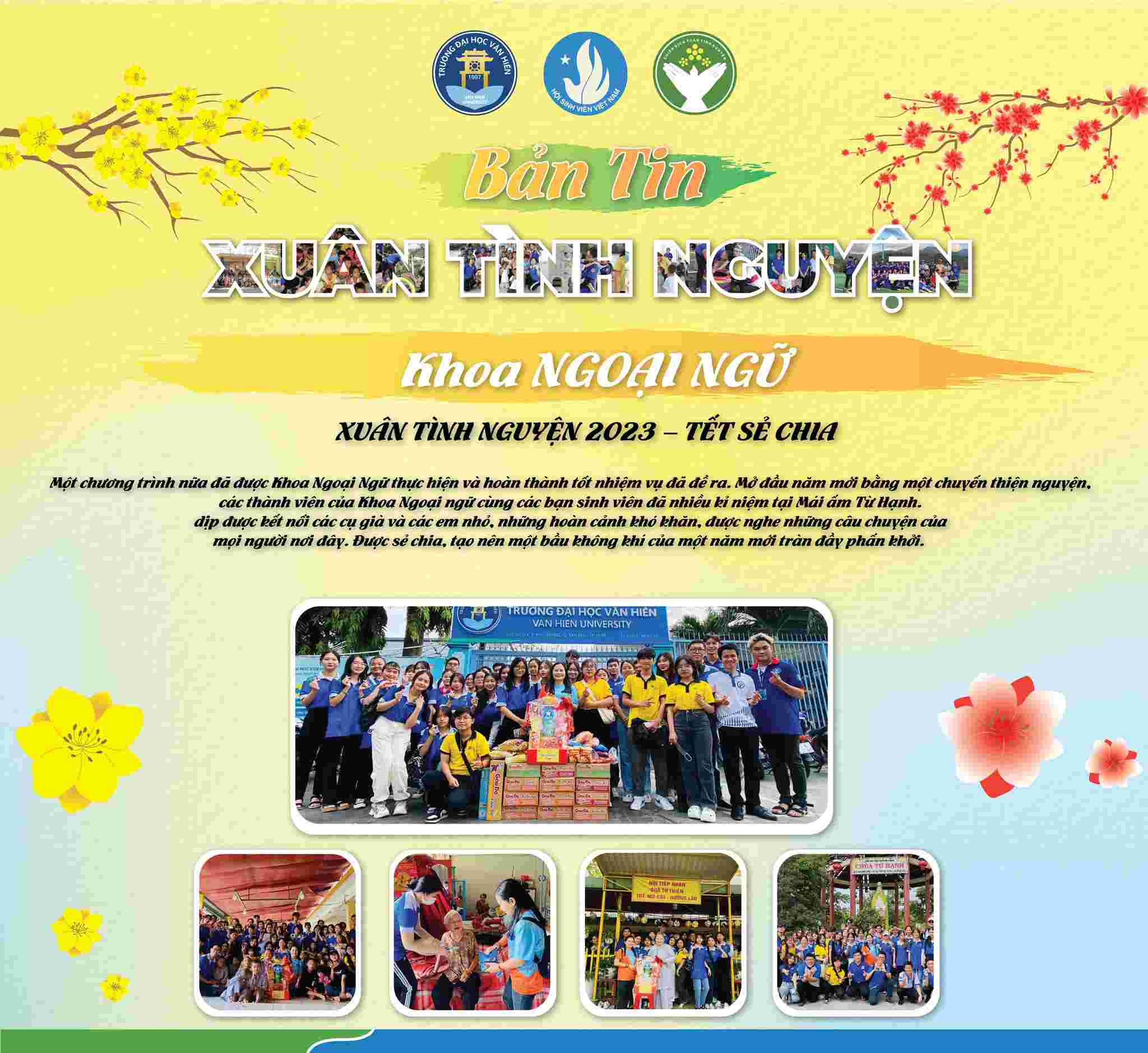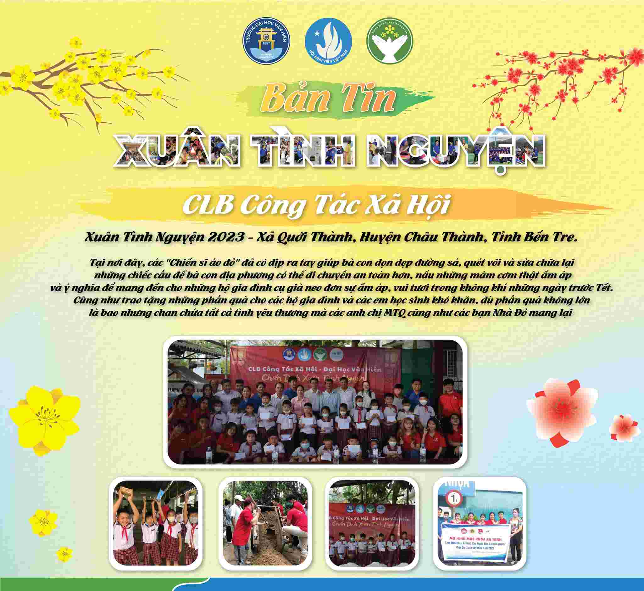 Chiến dịch Xuân Tình nguyện lần thứ 15 - năm 2023 đã khép lại với rất nhiều hoạt động cộng đồng nhằm lan tỏa yêu thương, khơi dậy và phát huy tinh thần tình nguyện của đoàn viên, thanh niên trường Đại học Văn Hiến, mang đến cho các em thiếu nhi có hoàn cảnh khó khăn, trẻ em khuyết tật, mồ côi tại các mái ấm, nhà mở, thăm hỏi Mẹ Việt Nam Anh Hùng, các gia đình chính sách, các chiến sĩ lực lượng vũ trang, học sinh, sinh viên không có điều kiện về quê đón tết, cải tạo không gian xanh và đặc biệt là xây dựng và trao tặng nhiều sân chơi thiếu nhi.