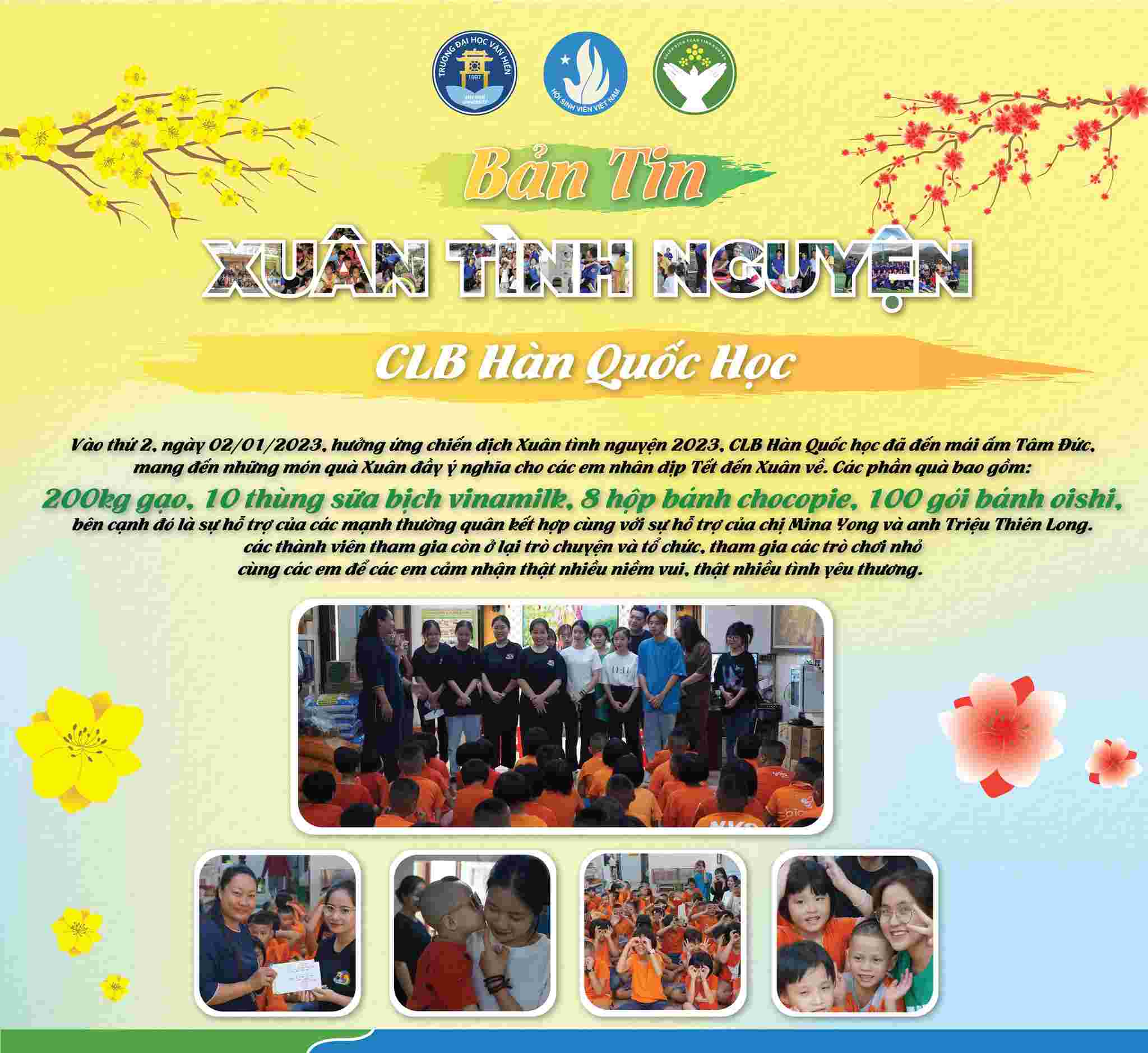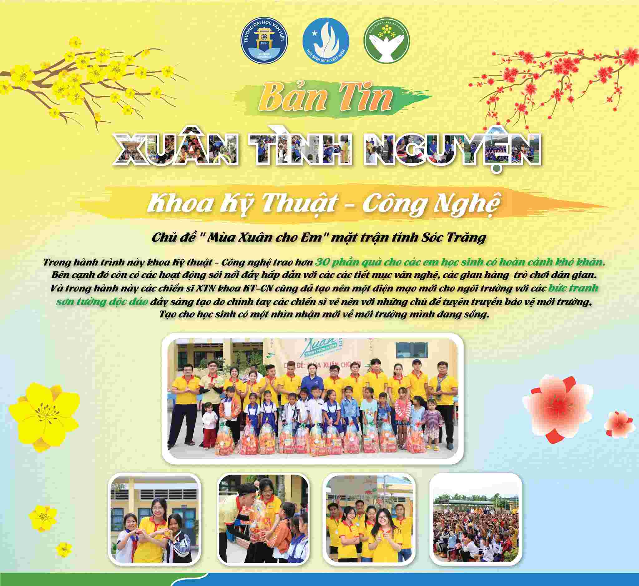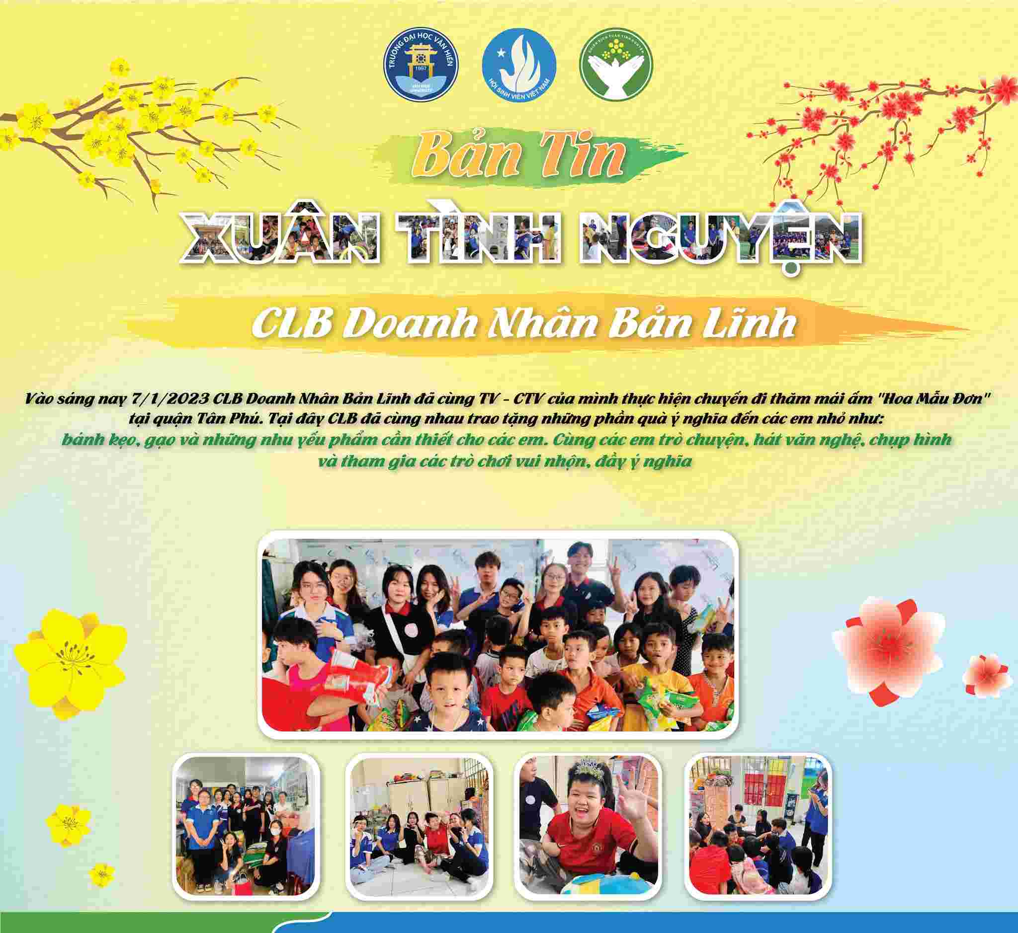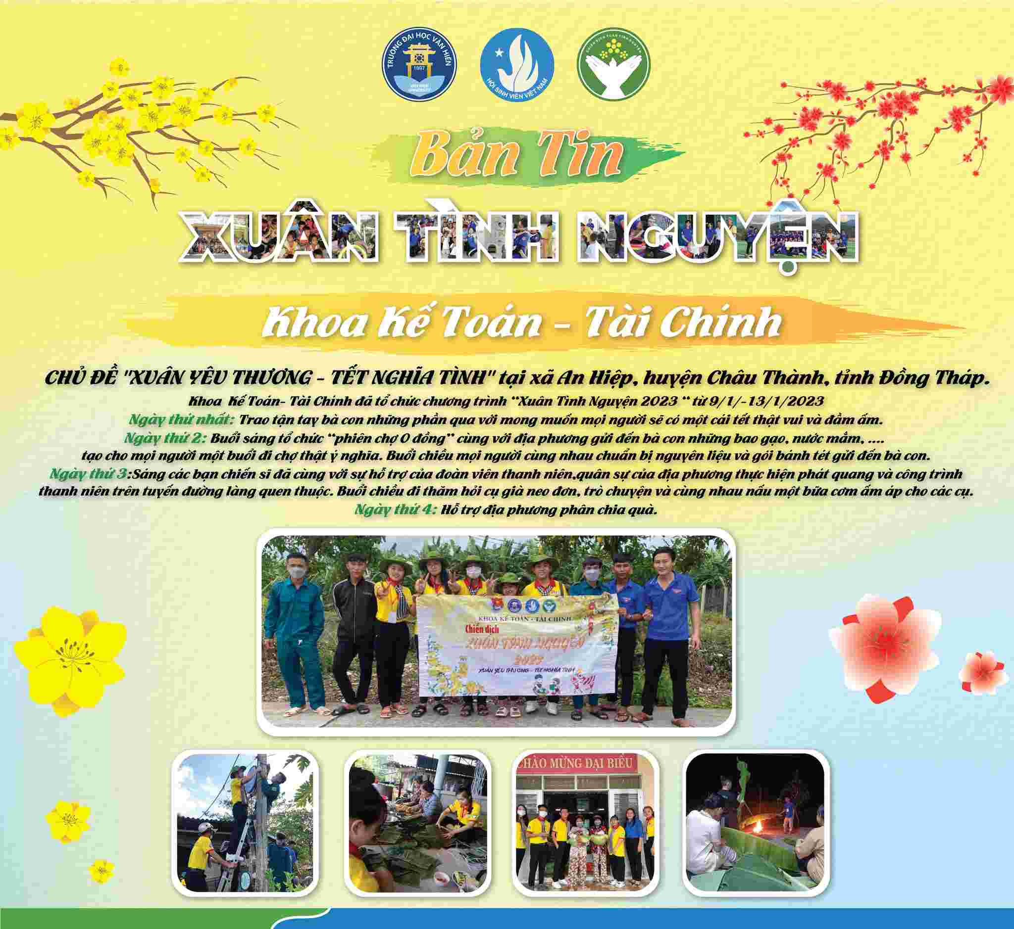 Chiến dịch Xuân Tình nguyện lần thứ 15 - năm 2023 đã khép lại với rất nhiều hoạt động cộng đồng nhằm lan tỏa yêu thương, khơi dậy và phát huy tinh thần tình nguyện của đoàn viên, thanh niên trường Đại học Văn Hiến, mang đến cho các em thiếu nhi có hoàn cảnh khó khăn, trẻ em khuyết tật, mồ côi tại các mái ấm, nhà mở, thăm hỏi Mẹ Việt Nam Anh Hùng, các gia đình chính sách, các chiến sĩ lực lượng vũ trang, học sinh, sinh viên không có điều kiện về quê đón tết, cải tạo không gian xanh và đặc biệt là xây dựng và trao tặng nhiều sân chơi thiếu nhi.